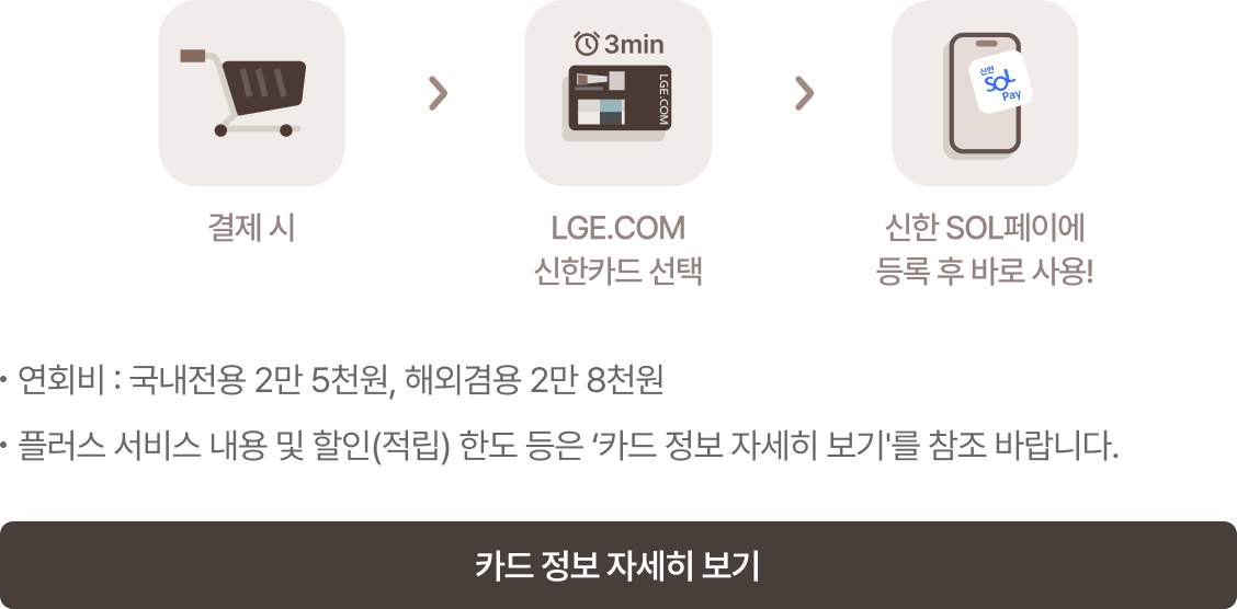 당월(1일~말일) 포인트 적립 서비스는 LGE.COM 신한카드의 전월(1일~말일) 이용금액에 따른 통합 한도 내에서 적용됩니다.