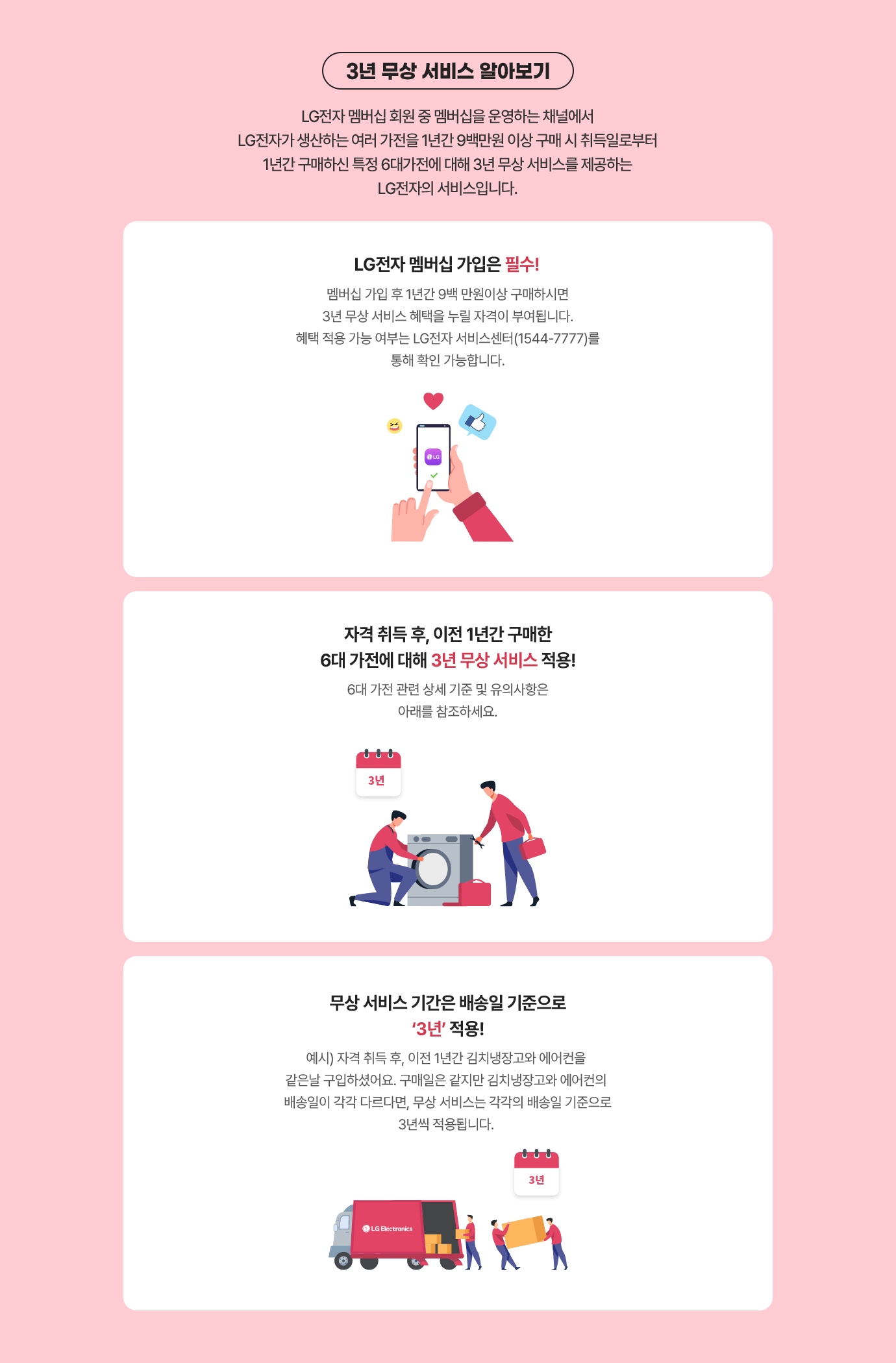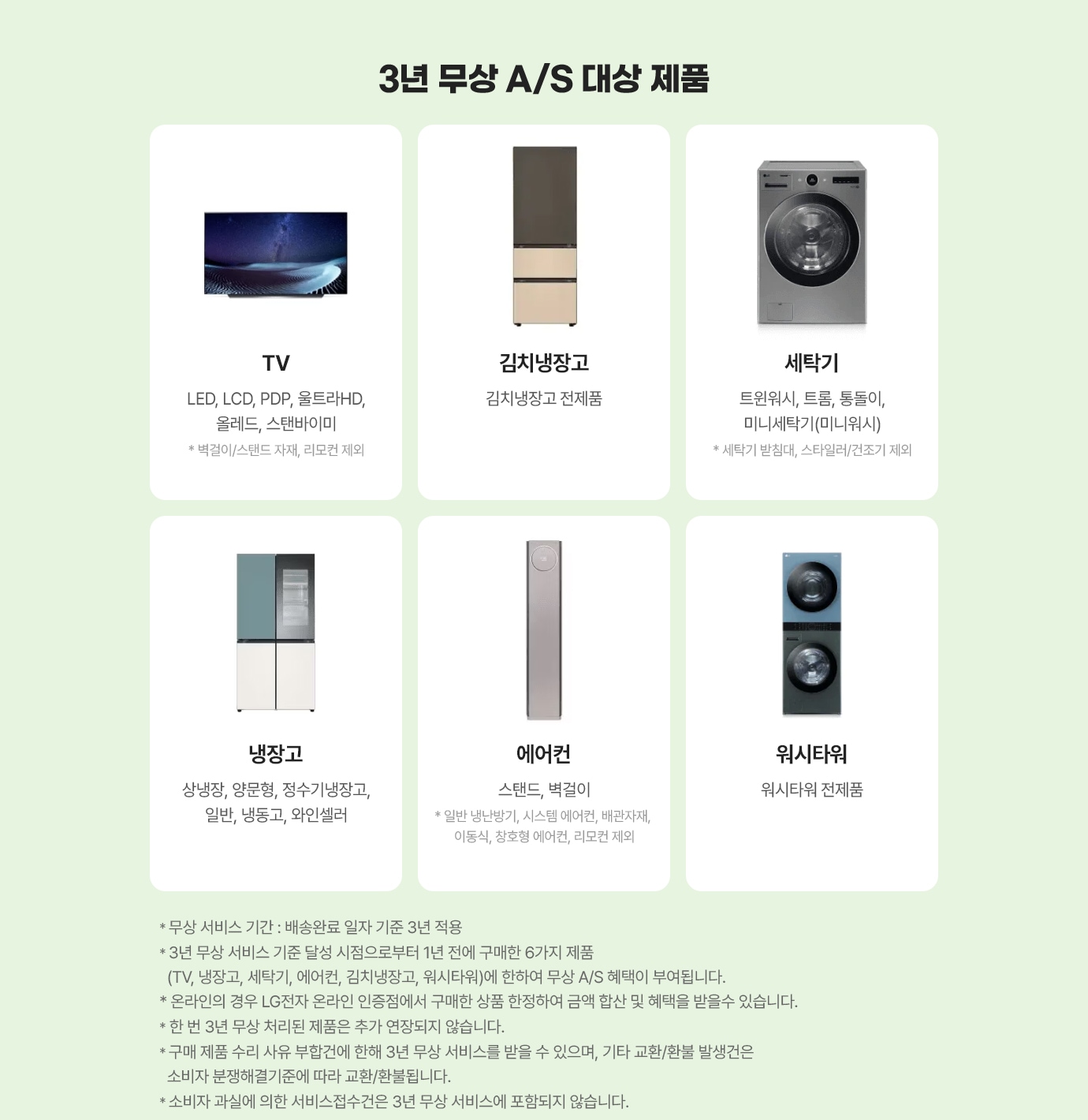 - 자격 취득 후, 이전 1년간 구매한 6대 가전에 대해 3년 무상 서비스 적용!
