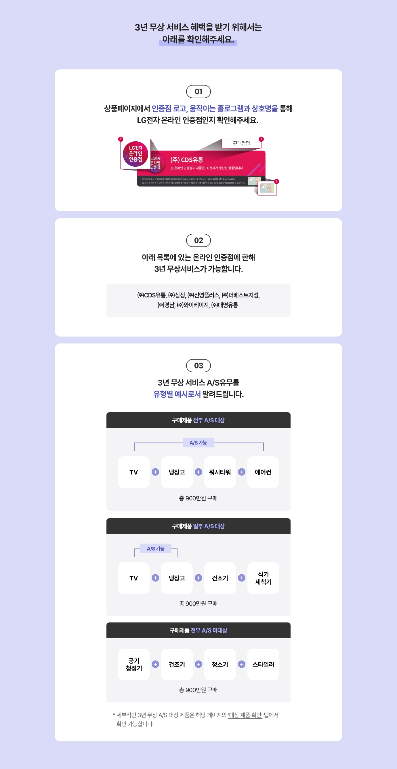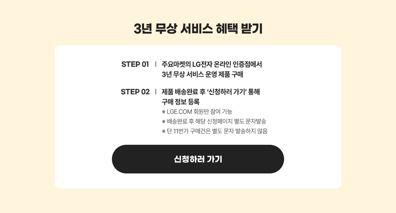 - STEP01 - 주요마켓의 LG전자 온라인 인증점에서 3년 무상 서비스 운영 제품 구매