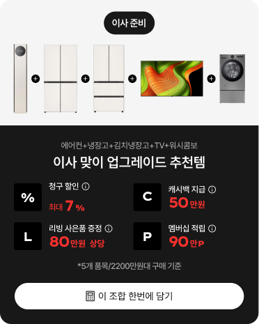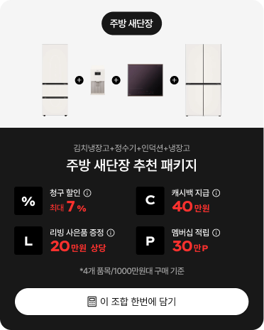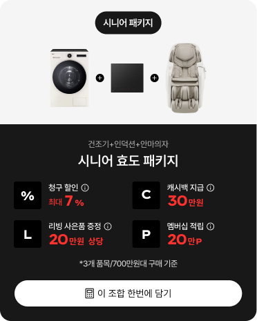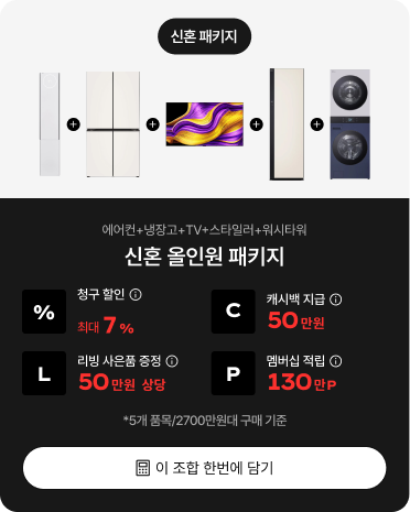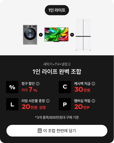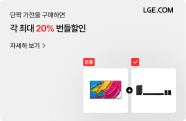 - 매월 동시 구매 혜택 적용 제품군과 모델이 달라지니, 매장 판매사원과 LGE.COM 기획전 ‘혜택 계산기'를 통해 확인하시기 바랍니다.