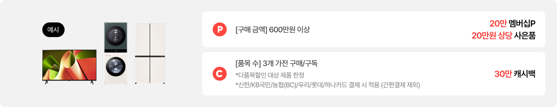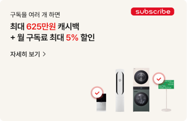- 행사 기간 내 LG전자 가전을 서로 다른 제품군으로 구매 혹은 구독 해야 다품목 캐시백 혜택이 적용됩니다. (예시: TV 3대 구매 시 혜택 적용 불가, TV 1대 구매 & TV 1개 구독 시 혜택 적용 불가) 구매+구독 또는 구매 건으로 결제한 건에 한해 합산하여 지급이 가능하며, 구독 단독으로 결제한 건은 지급되지 않습니다.