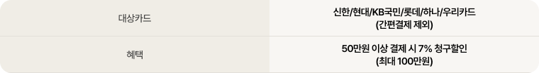 - KB국민/신한/NH농협(BC 포함)/우리/롯데/하나(외환) 카드로 결제 시에만 적용되며, 대상 품목일 경우 카드사명과 캐시백 금액이 별도 표기됩니다.