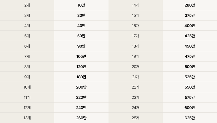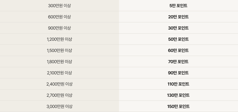- 임직원, 복지몰 구매의 경우, 일반 구매 건과 합산하여 지급되지 않습니다.