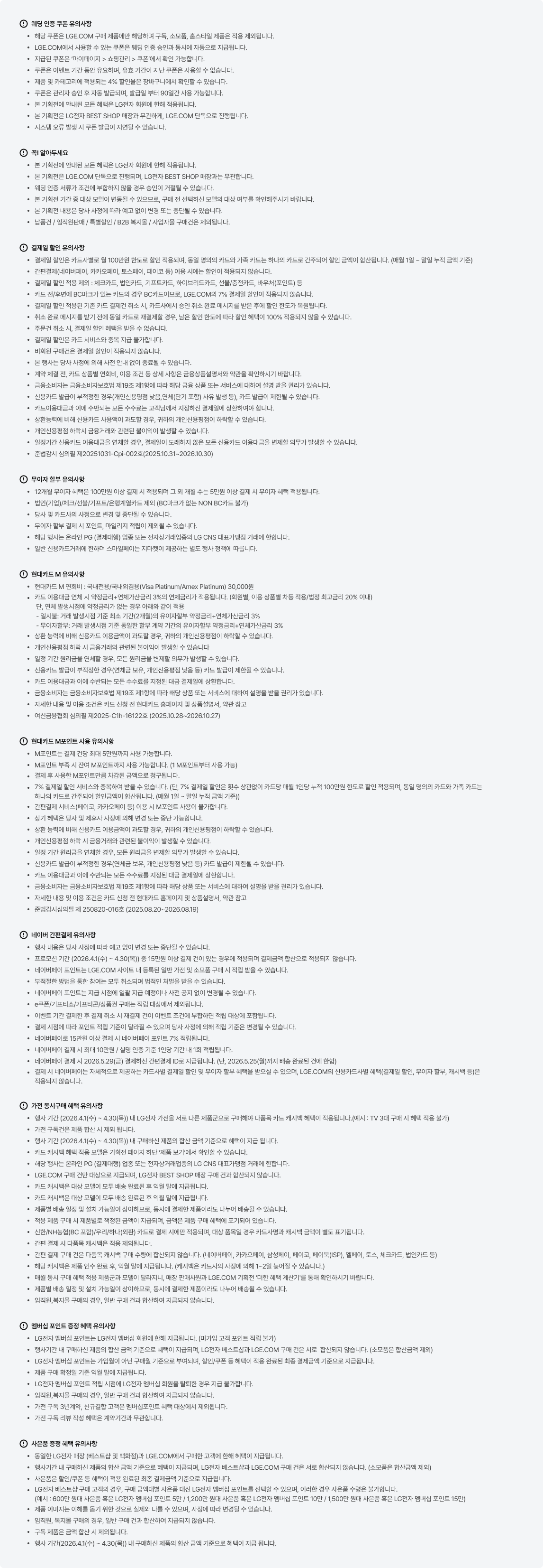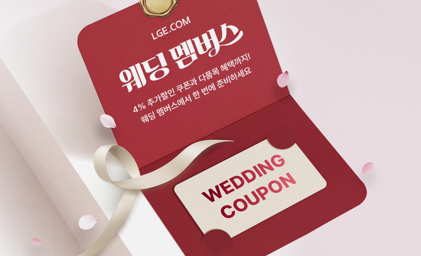 LGE.COM 4% 가전 추가 할인 쿠폰. [엘지닷 한정] LGE.COM 4% 홈스타일 추가 할인 쿠폰. (2026.2.2(월) ~ 2.18(수) 이내에 웨딩 인증 후 승인 완료된 고객)