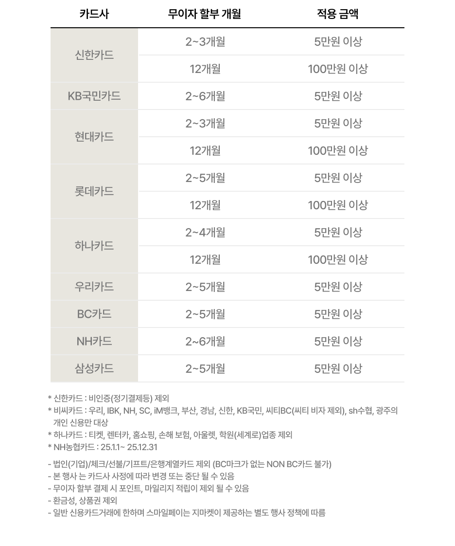 | 카드사 | 무이자 할부 개월 | 적용 금액 |