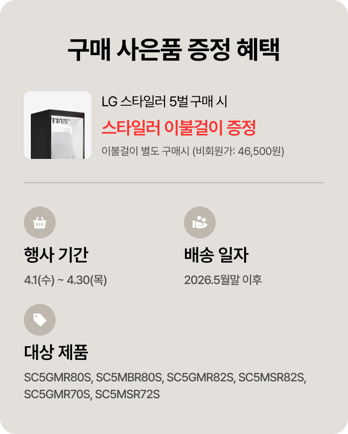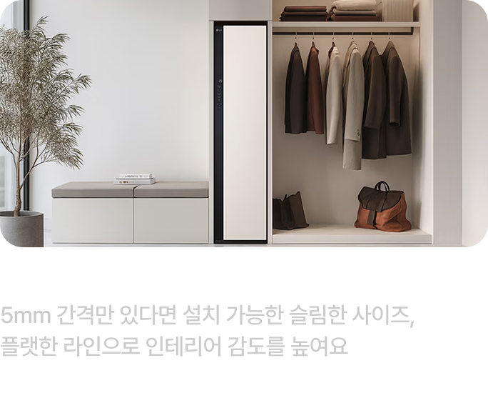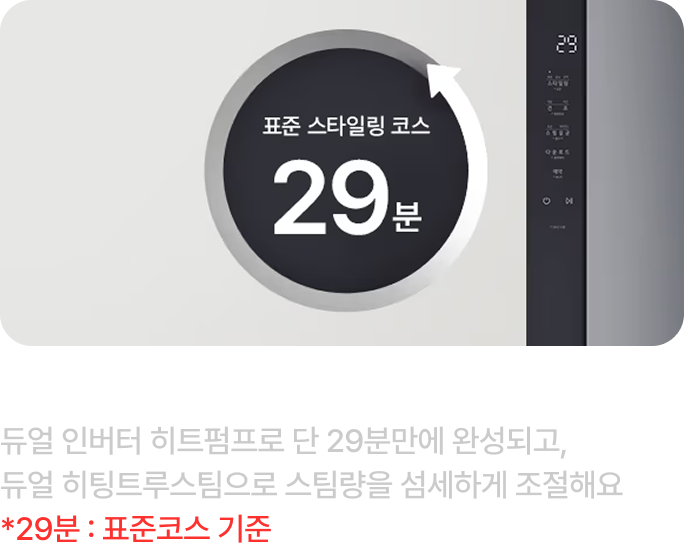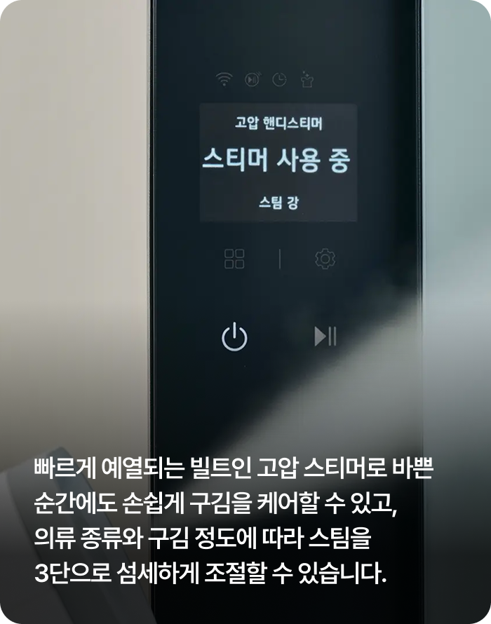 빠르게 예열되는 빌트인 고압 스티머로 바쁜 순간에도 손쉽게 구김을 케어할 수 있고, 의류 종류와 구김 정도에 따라 스팀을 3단으로 섬세하게 조절할 수 있습니다.