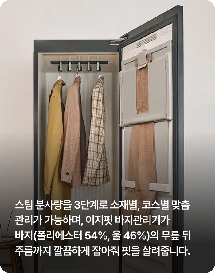 스팀 분사량을 3단계로 소재별, 코스별 맞춤 관리가 가능하며, 이지핏 바지관리기가 바지(폴리에스터 54%, 울 46%)의 무릎 뒤 주름까지 깔끔하게 잡아줘 핏을 살려줍니다.