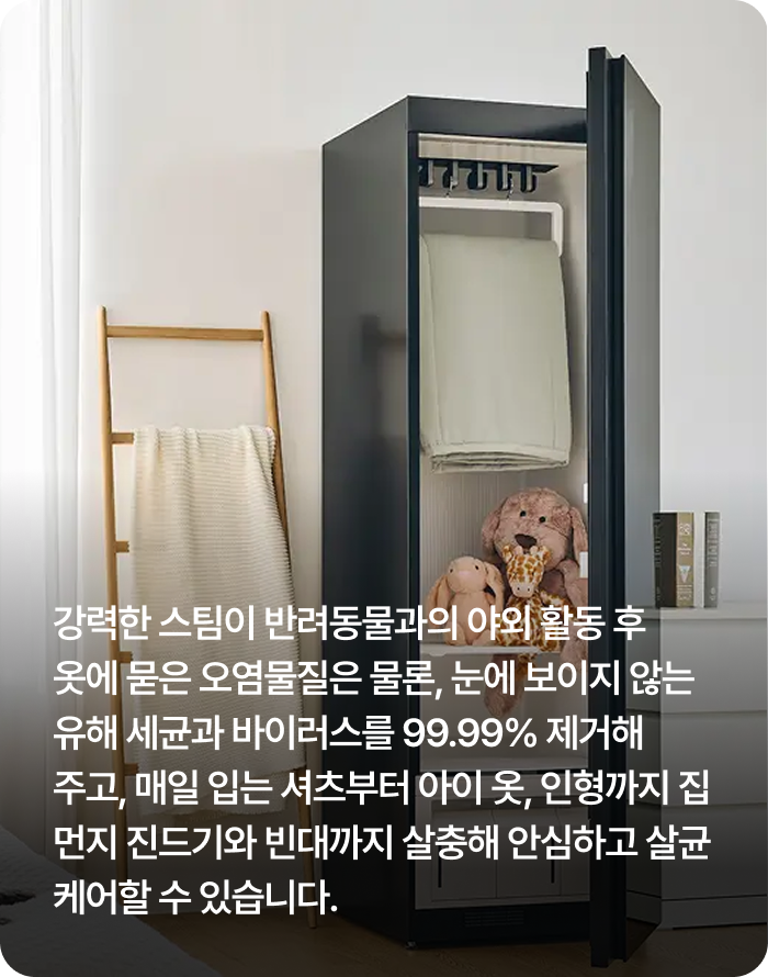 강력한 스팀이 반려동물과의 야외 활동 후 옷에 묻은 오염물질은 물론, 눈에 보이지 않는 유해 세균과 바이러스를 99.99% 제거해주고, 매일 입는 셔츠부터 아이 옷, 인형까지 집먼지 진드기와 빈대까지 살충해 안심하고 살균 케어할 수 있습니다.