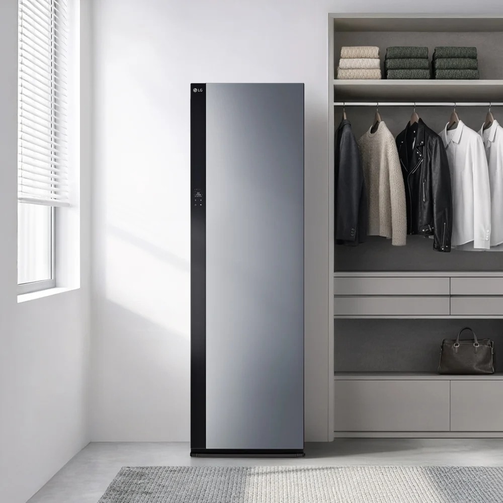 스타일러 내부에 코트와 셔츠가 걸려있고, 도어 안쪽 바지 관리기에는 바지가 걸려있습니다.