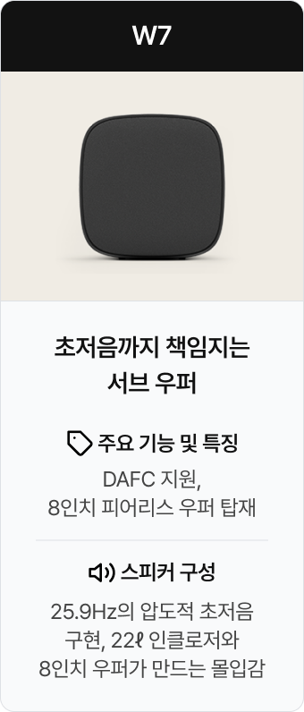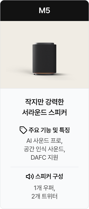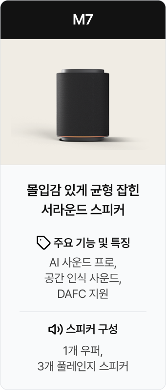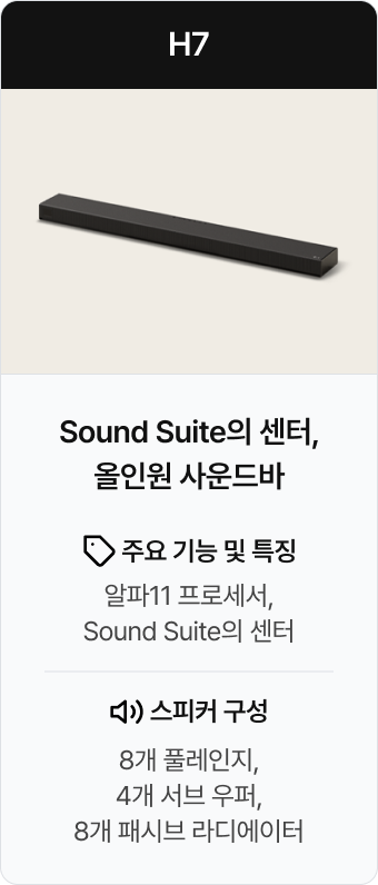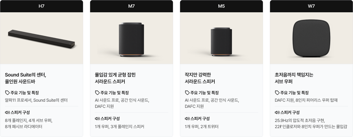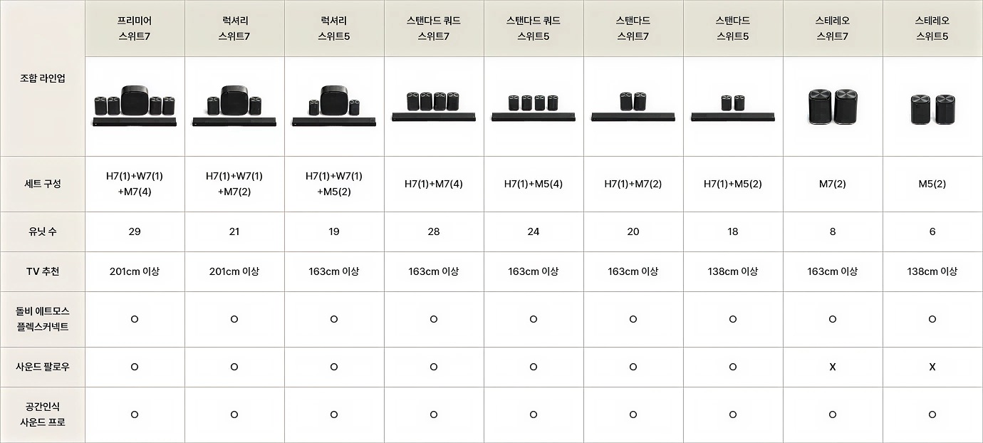 | 조합 라인업 | 사운드바 1개, 우퍼 1개, 스피커 4개 연출 이미지 | 사운드바 1개, 우퍼 1개, 스피커 2개 연출 이미지 | 사운드바 1개, 우퍼 1개, 소형 스피커 2개 연출 이미지 | 사운드바 1개, 스피커 4개 연출 이미지 | 사운드바 1개, 소형 스피커 4개 연출 이미지 | 사운드바 1개, 스피커 2개 연출 이미지 | 사운드바 1개, 소형 스피커 2개 연출 이미지 | 스피커 2개 연출 이미지 | 소형 스피커 2개 연출 이미지 |