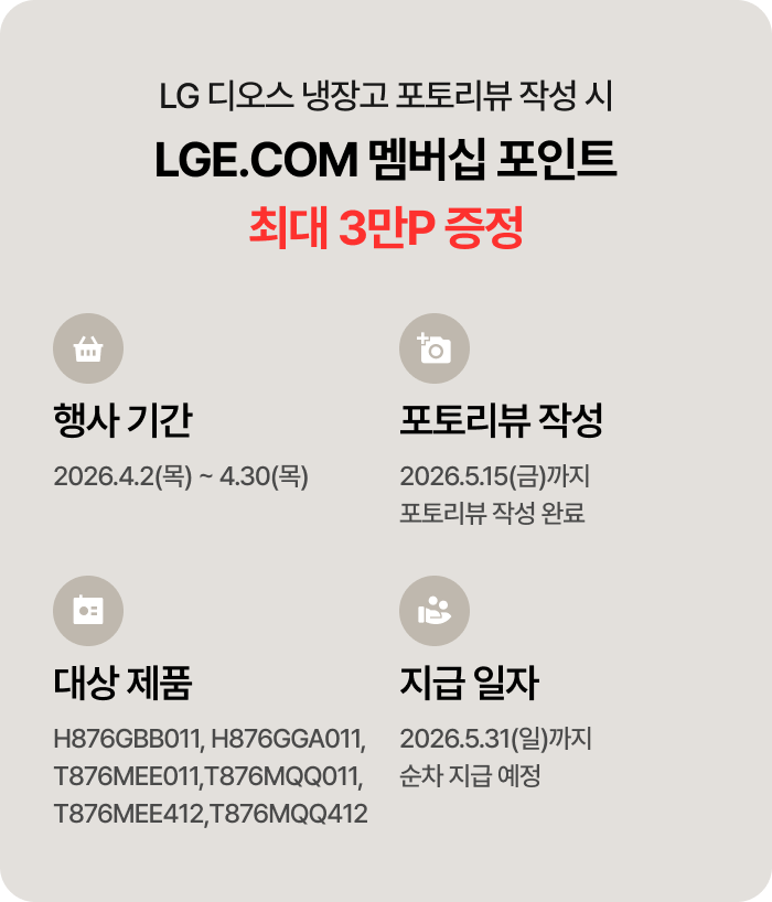 LG 디오스 냉장고 포토리뷰 작성 시 LGE.COM 멤버십 포인트 최대 3만P 증정