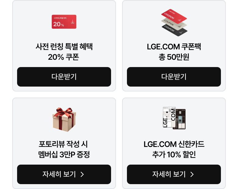 LGE.COM COUPON 문구가 적힌 빨간색, 연회색, 진회색 쿠폰 세 장이 겹쳐진 아이콘