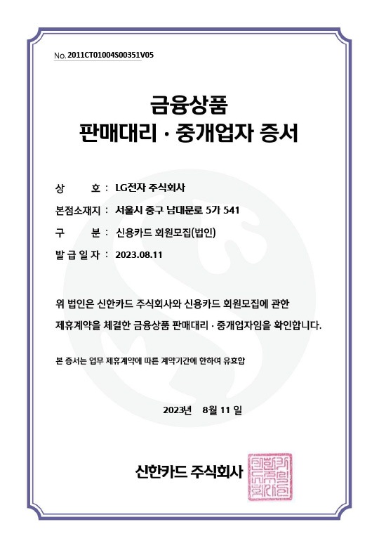 위 법인은 신한카드 주식회사와 신용카드 회원모집에 관한 제휴계약을 체결한 금융상품 판매대리·중개업자임을 확인합니다.