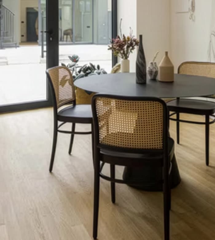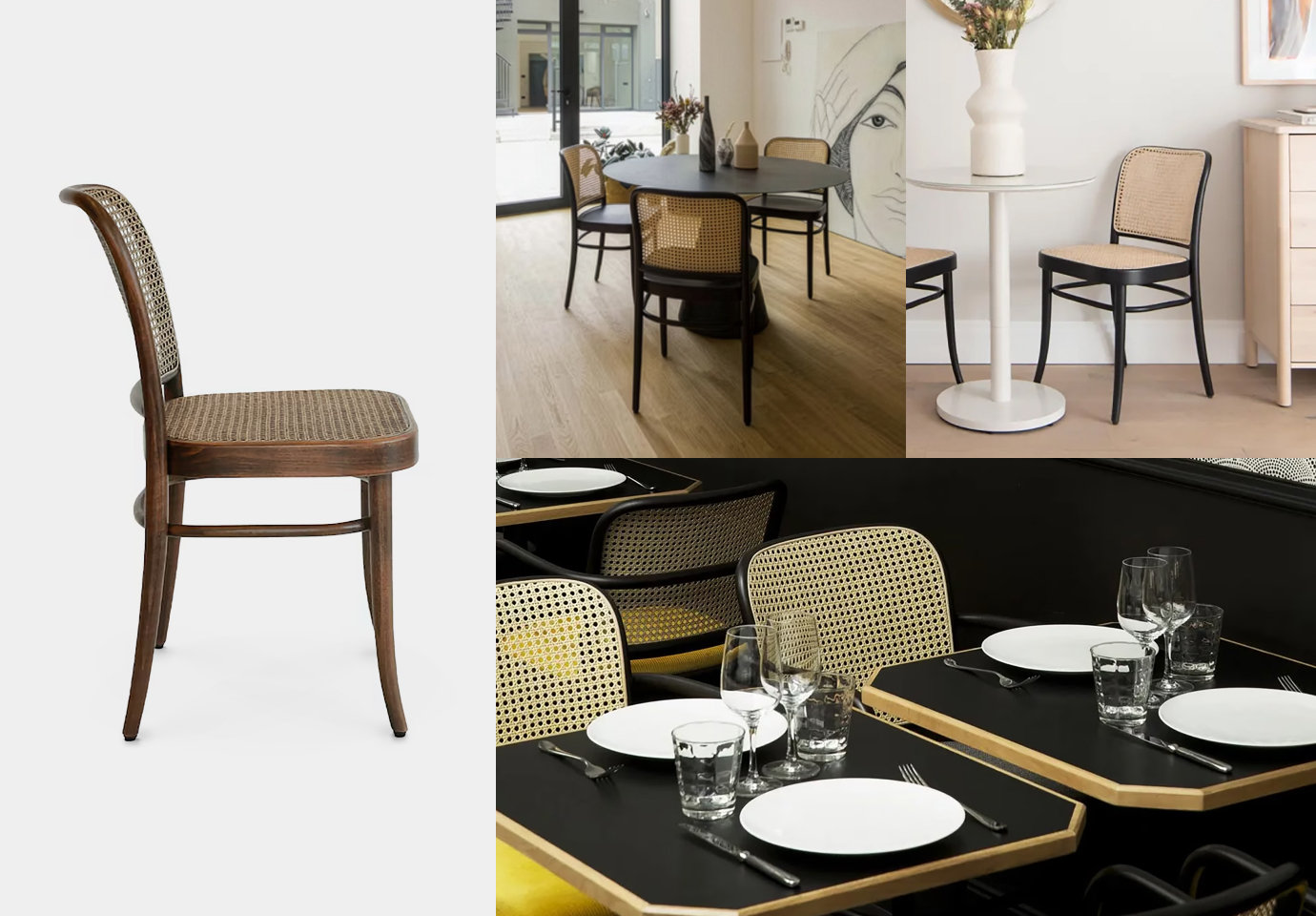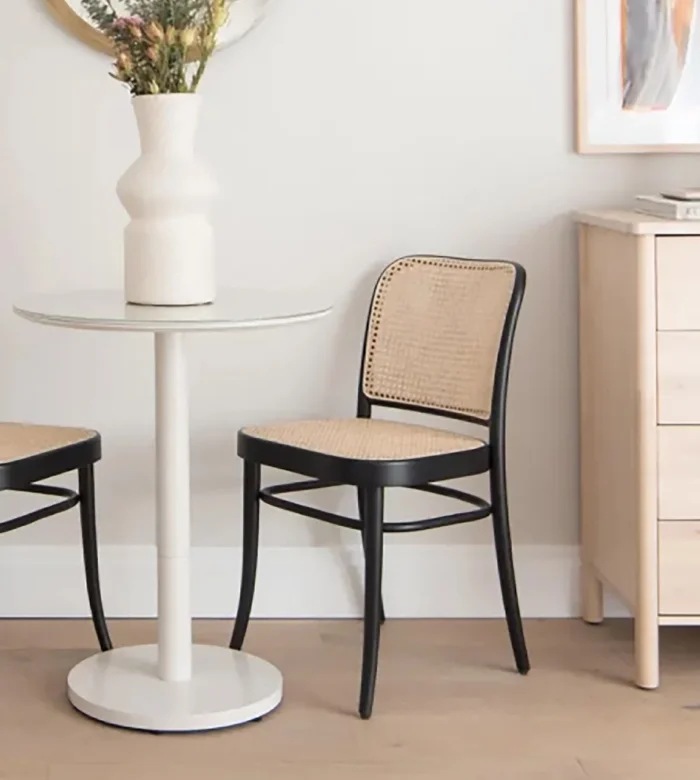 특히 라탄 소재의 등받이가 특징이며, 가정집이나 카페 등 다양한 공간에 잘 어울립니다.